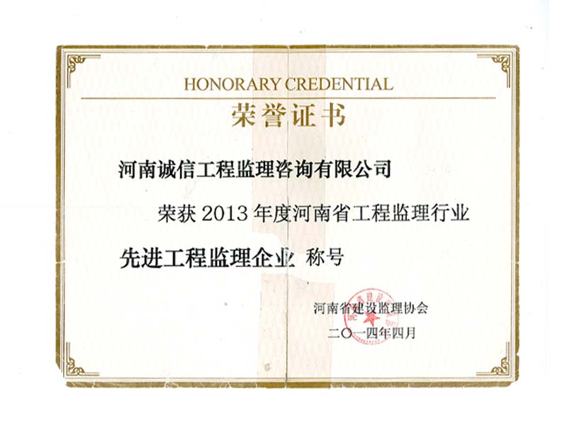 榮獲2013年度河南省工程監(jiān)理行業(yè)“先進(jìn)工程監(jiān)理企業(yè)”稱號