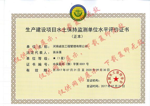生產(chǎn)建設(shè)項目水土保持監(jiān)測單位水平評價證書